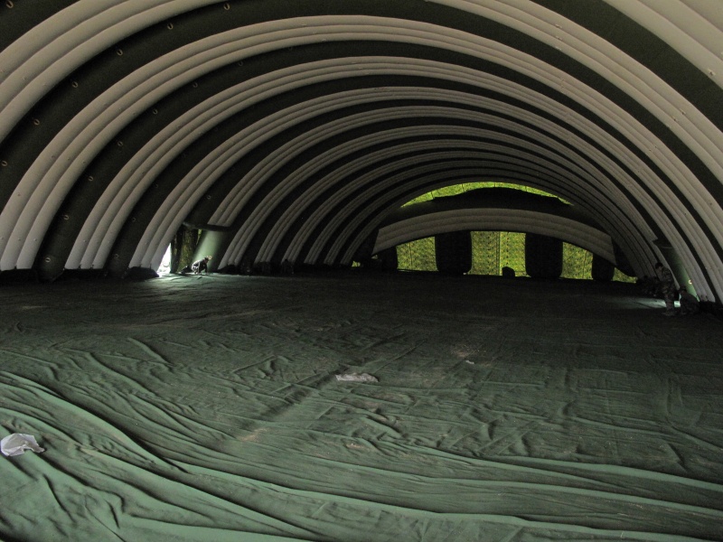 采用模塊化結構設計,以充氣式結構氣囊為基本結構單元,實現(xiàn)整體結構造型,可快速提供安全可靠的大型室內空間場所,是一款集復合材料技術、偽裝技術、機電技術、傳感技術和自動化技術于一體的新型產品。在軍用領域,該產品可用于移動式機庫、裝備維修保障工作站、彈藥庫、指揮中心、野外醫(yī)院等。在民用領域,用作應急救援大型安置場所、通航機場機庫、物資倉庫、臨時展館、會議中心等